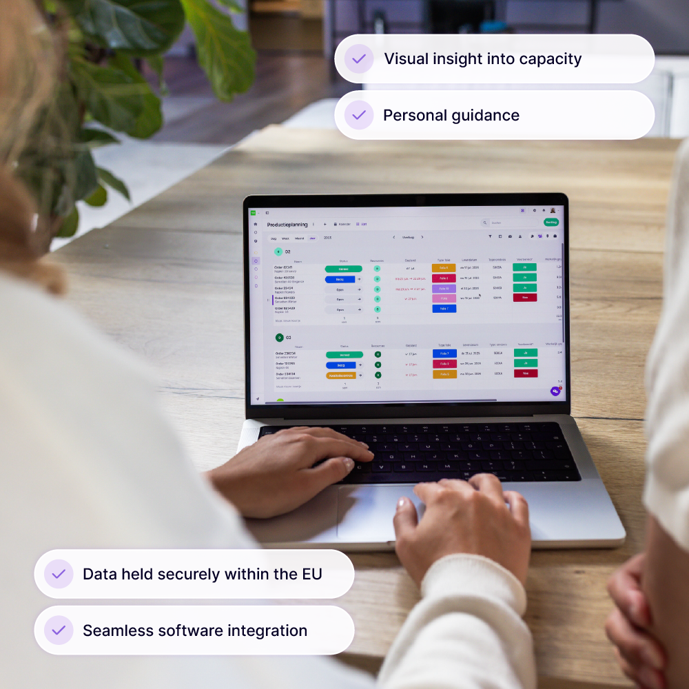 Iedereen werkt met dezelfde, actuele planning, via desktop of app. Wijzigingen zijn direct zichtbaar en de weergave pas je aan op je eigen voorkeur.